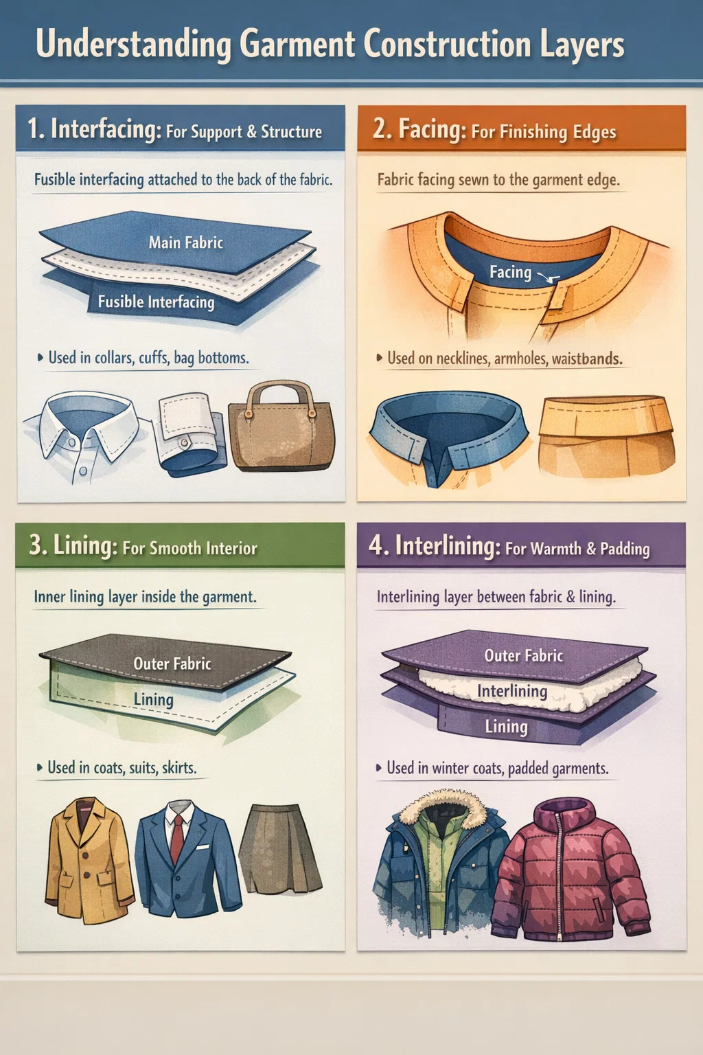 Cum se folosește: este intercalat între ele. Mai întâi stratificați intercalarea și materialul principal împreună și le coaseți ca un singur strat, apoi le acoperiți cu căptușeala. Nu este nici împotriva corpului, nici vizibil din exterior.