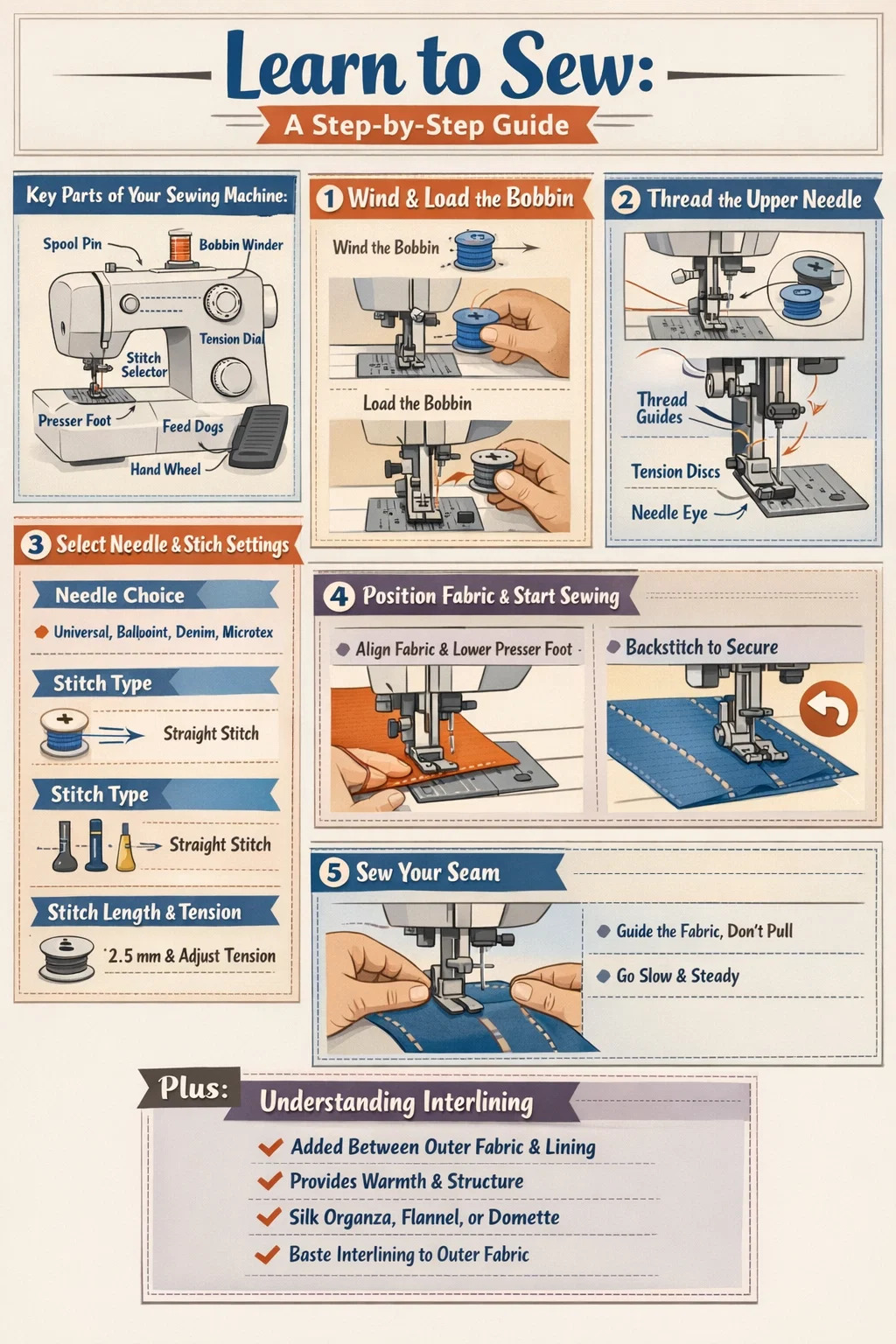 A învăța cum să lucrezi o mașină de cusut pas cu pas este mai simplu decât se așteaptă majoritatea începătorilor. Procesul de bază se rezumă la cinci acțiuni: configurați mașina, înfășurați și încărcați bobina, înfilați acul superior, selectați cusătura și coaseți. Odată ce aveți aceste elemente fundamentale jos, puteți aborda orice, de la tivuri de bază până la articole de îmbrăcăminte structurate care folosesc intercalare — un strat ascuns cusut între materialul exterior și căptușeală, care adaugă corp, formă și căldură. Acest ghid parcurge fiecare pas în detaliu, astfel încât să puteți trece de la un începător complet la un cusut încrezător.
