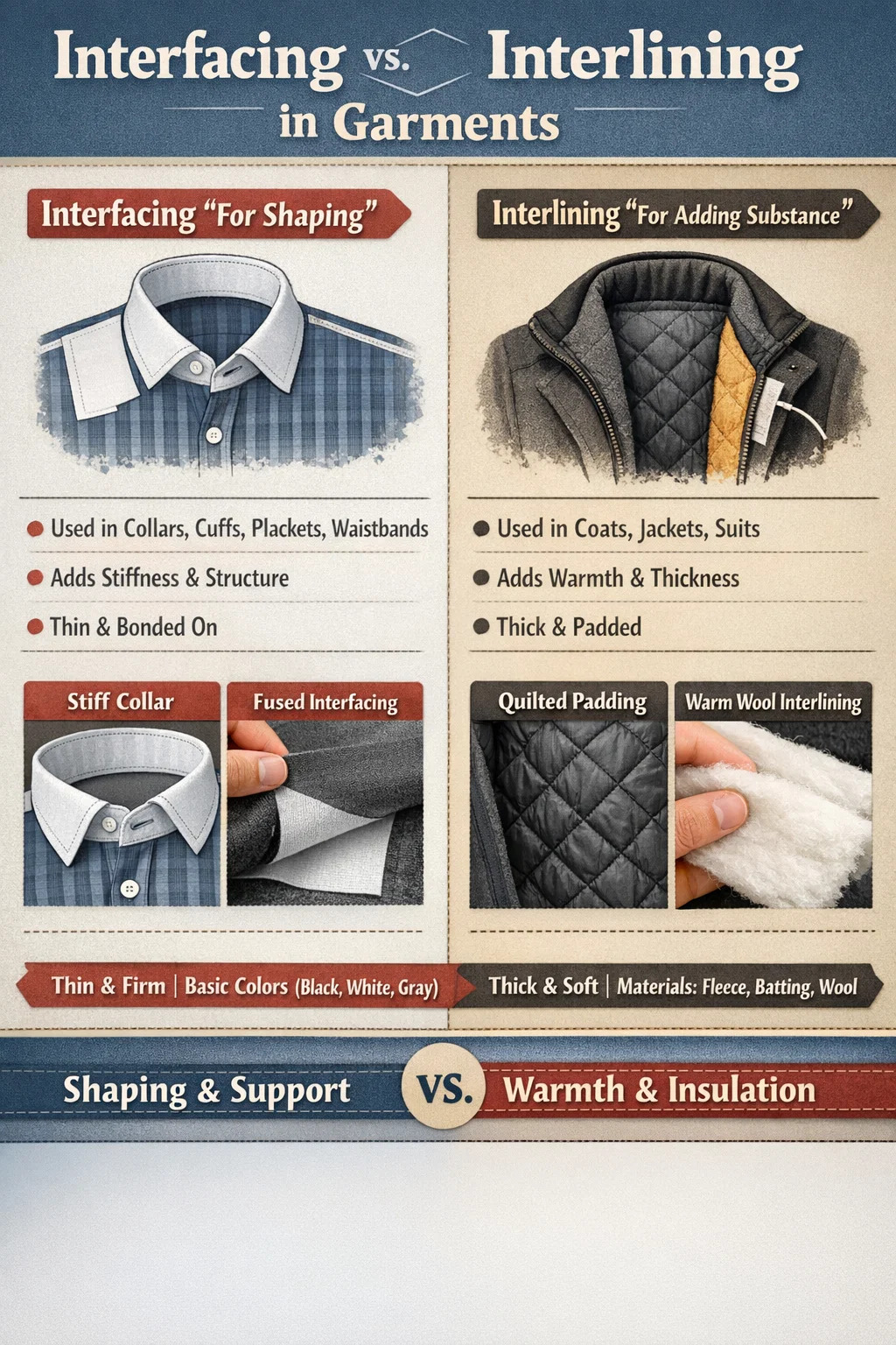 În fabricarea confecțiilor și prelucrarea țesăturilor, intercalare iar interfața sunt ca „scheletul invizibil” și „stratul izolator” al îmbrăcămintei. Deși ambele sunt ascunse în interiorul îmbrăcămintei, ele servesc unor scopuri complet diferite.