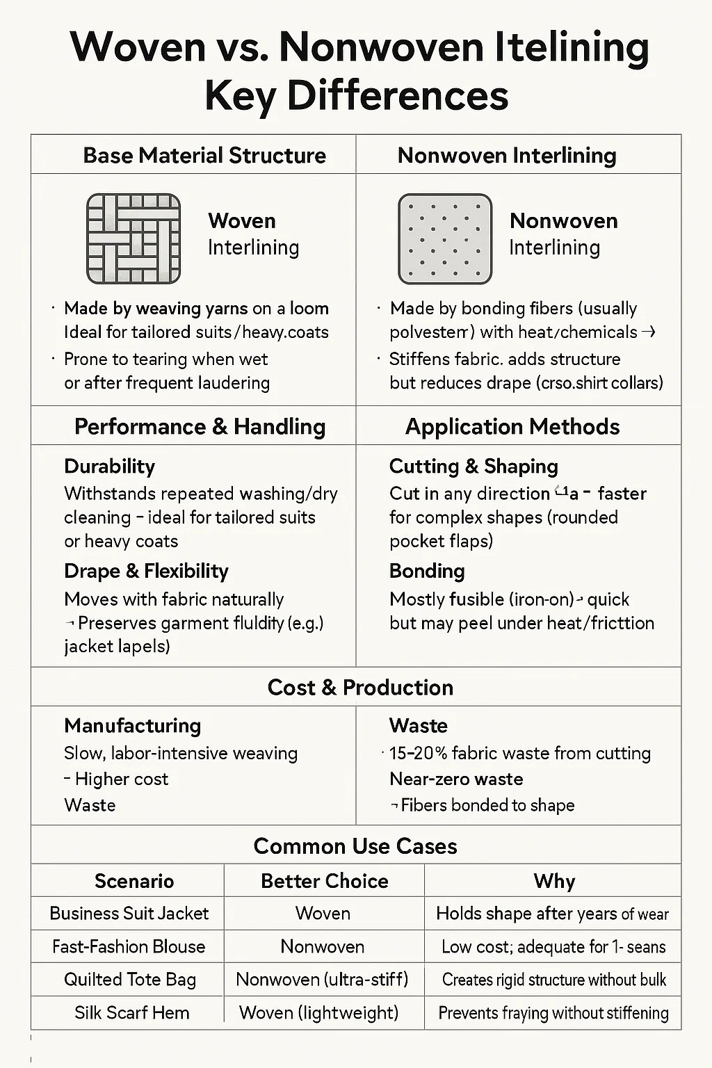 Țesut interlined : Realizat prin țesutul firelor (bumbac, poliester sau amestecuri) pe un țesut → are linii de cereale distincte (urzeală/bătăi).